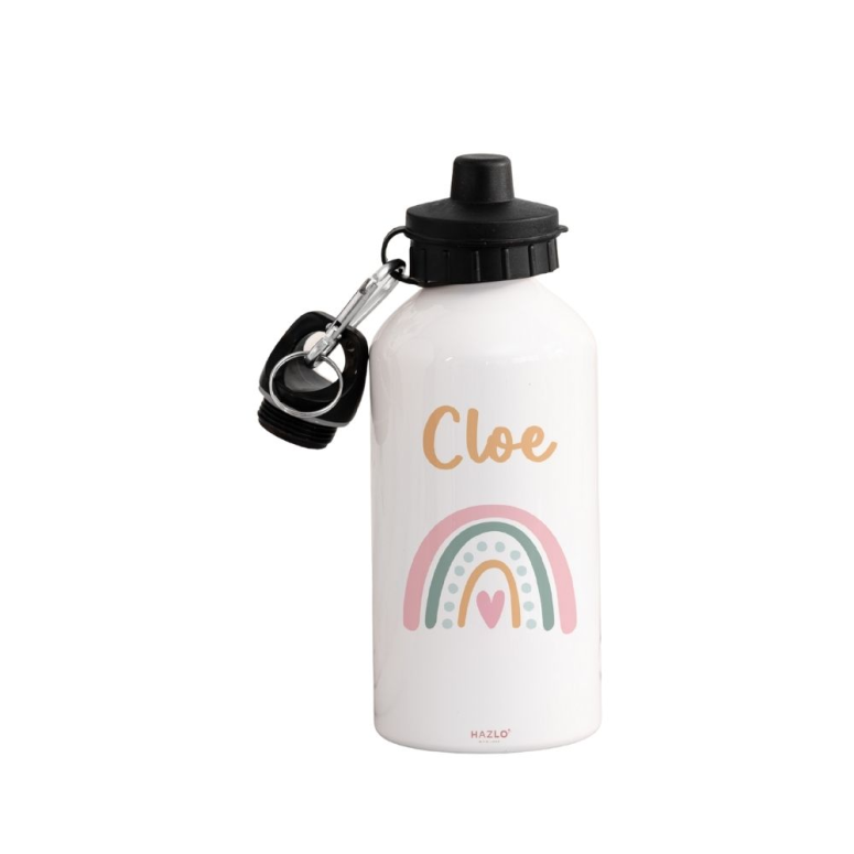Personaliza la cantimplora infantil y juvenil con su Nombre sobre el diseño Arco Iris y convierte cada bebida en recuerdos únicos, llenos de color, alegría y fantasía con nuestra cantimplora blanca Arco Iris.
