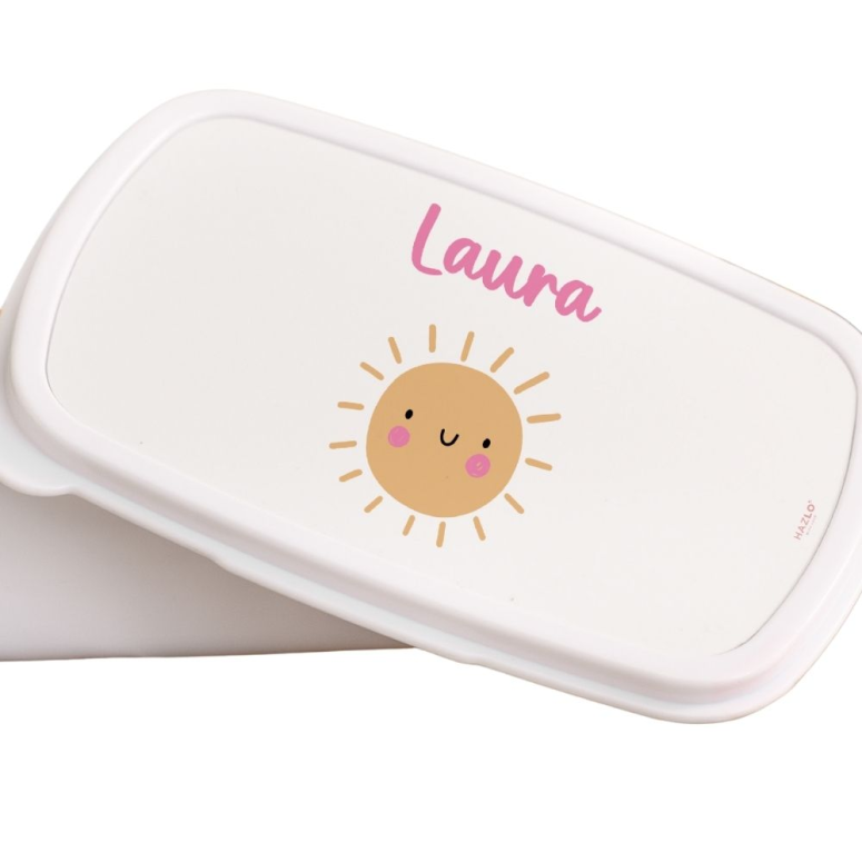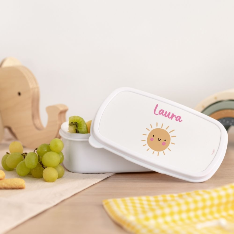 Personaliza la fiambrera blanca con su Nombre sobre el diseño Sol y convierte cada comida en recuerdos llenos de energía, alegría y fantasía.