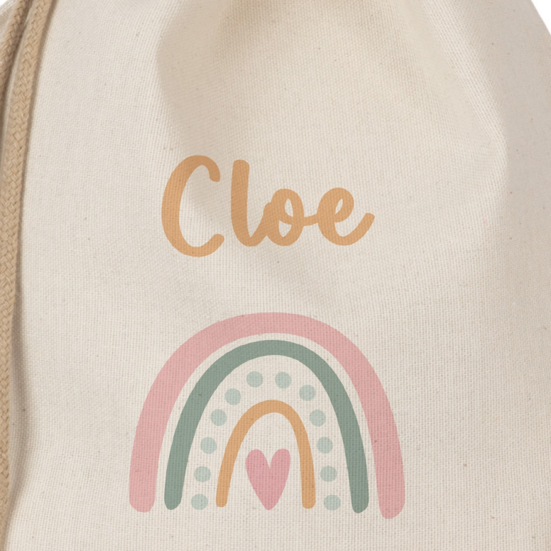 Mochila tipo saco "Aventuras Dulces" con diseño Nube personalizada con su Nombre. Tela reciclada resistente, cierre de cordón, ligera y cómoda. Ideal para colegio, excursiones o actividades al aire libre.