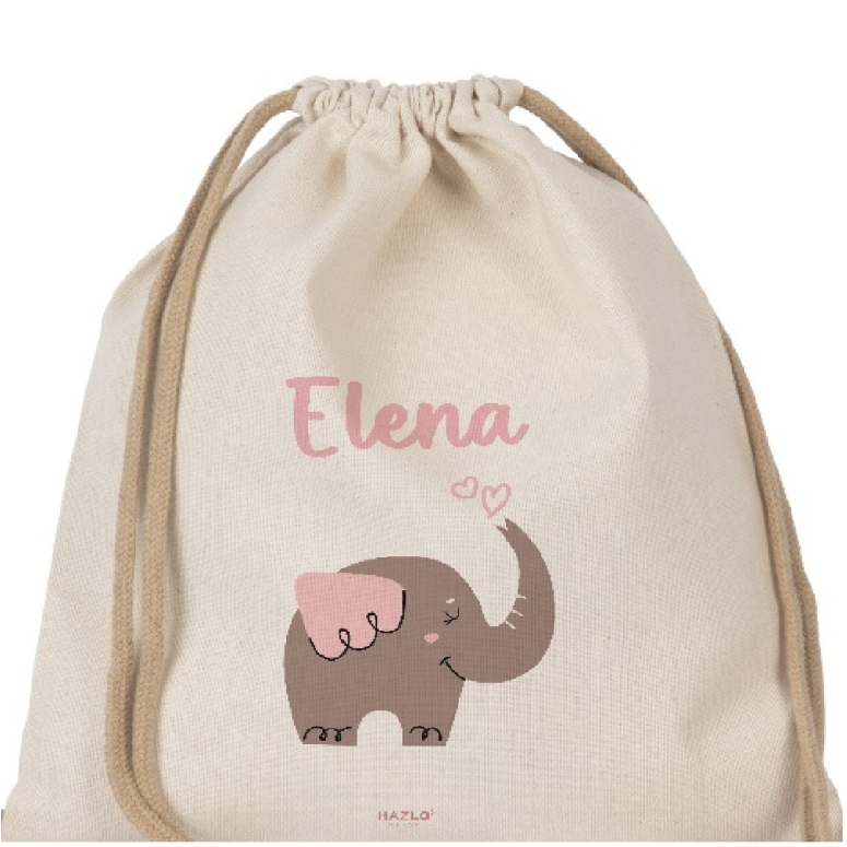 Personaliza la bolsa de tela con su Nombre sobre el diseño Elefante y convierte cada salida en recuerdos únicos, llenos de exploración y naturaleza con nuestra mochila blanca Elefante.