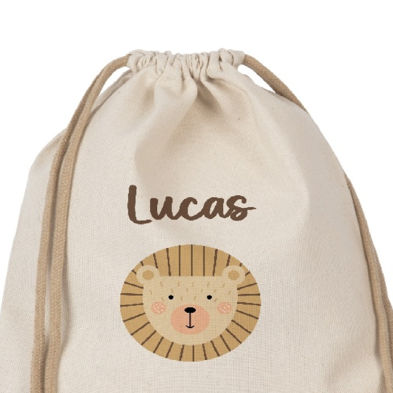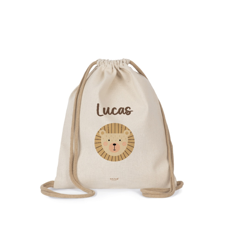 Mochila tipo saco "Aventuras África" con diseño Elefante personalizada con su Nombre. Tela reciclada resistente, cierre de cordón, ligera y cómoda. Ideal para colegio, excursiones o actividades al aire libre.