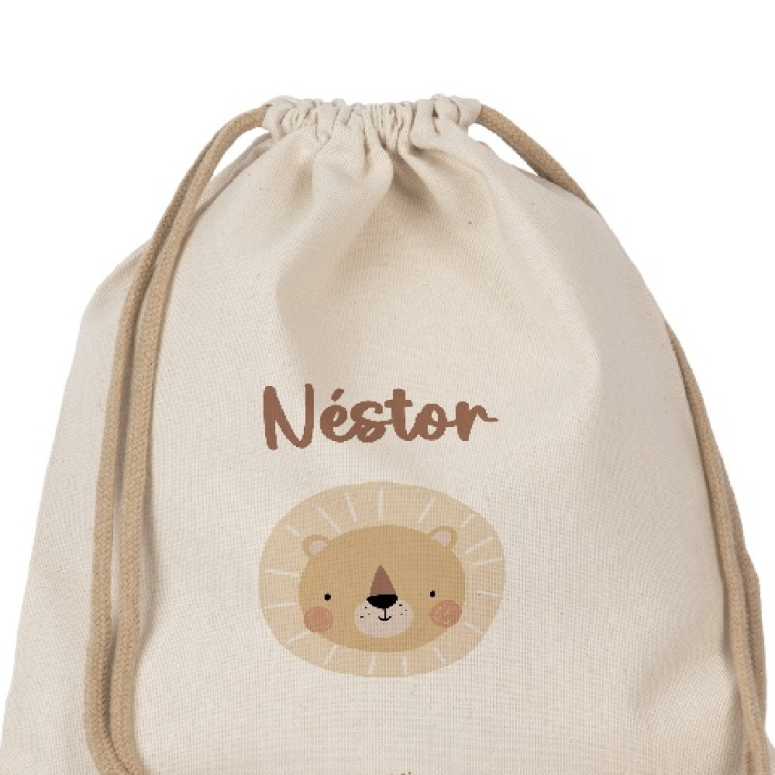 Mochila tipo saco "Aventuras en la Sabana Africana" con diseño León África personalizada con su Nombre. Tela reciclada resistente, cierre de cordón, ligera y cómoda. Ideal para colegio, excursiones o actividades al aire libre.