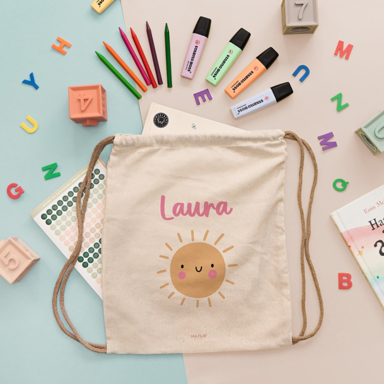 Imagina a tu peque llevando el diseño Sol junto a su Nombre, hecha con tela reciclada resistente y sostenible, ligera y con cierre de cordones fácil de usar, perfecta para fomentar la independencia de los más pequeños.