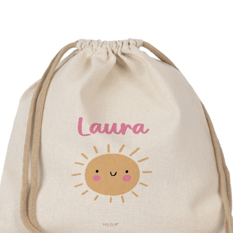 Personaliza la bolsa de tela con su Nombre sobre el diseño Sol y convierte cada salida en recuerdos únicos, llenos de energía y alegría con nuestra mochila blanca Sol.