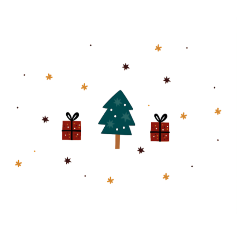 Diseño exclusivo: Ilustración navideña con regalos, árbol y estrellas sobre fondo blanco.
