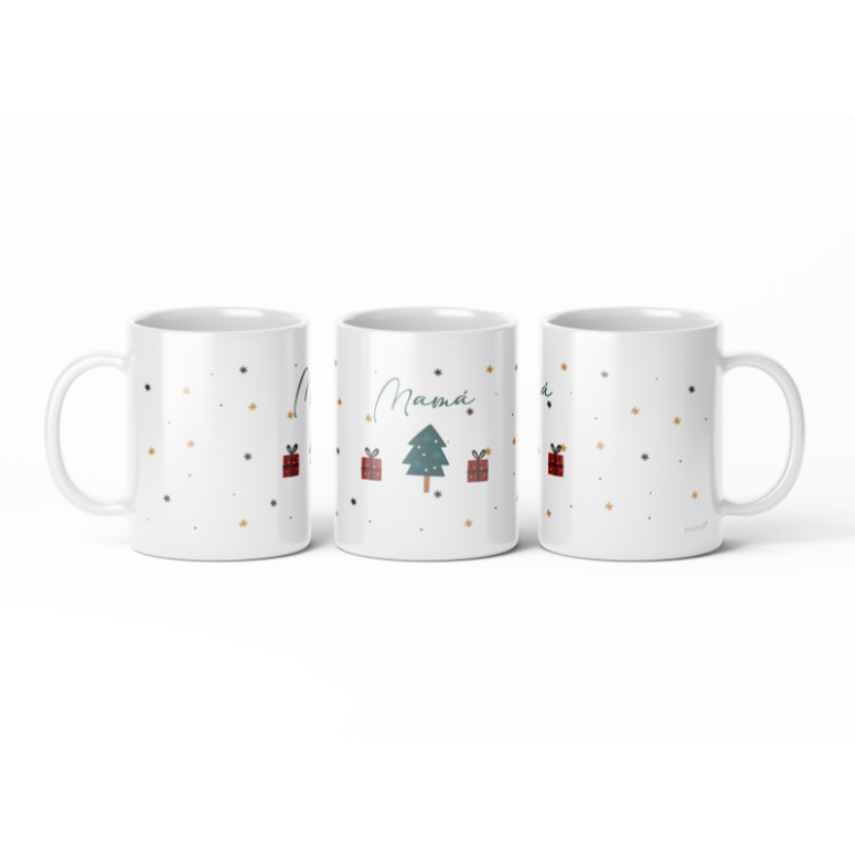 Una taza navideña llena de detalles encantadores: regalos, estrellitas y el nombre que tú elijas. Ideal para regalar y compartir momentos cálidos estas fiestas.