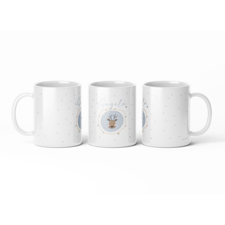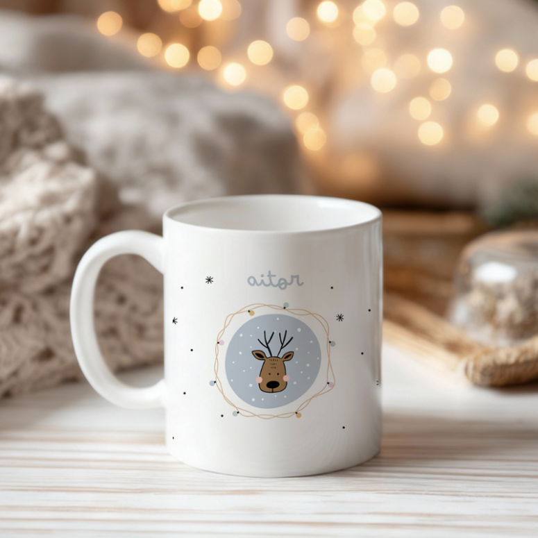 Dicen que los renos son los guardianes secretos de los sueños navideños. Esta taza está inspirada en esa magia tranquila y cálida que solo el invierno puede traer. Su protagonista, un reno dulce sobre un fondo azul suave con estrellitas, viene acompañado por el nombre que tú elijas para hacerlo aún más especial.