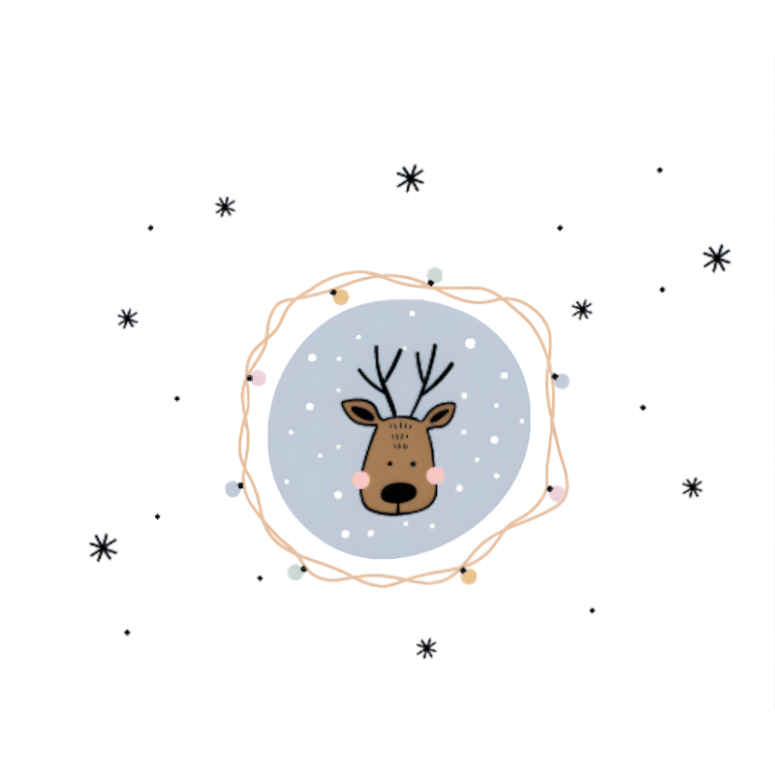 Diseño navideño encantador: Reno ilustrado con fondo de nieve y colores suaves.